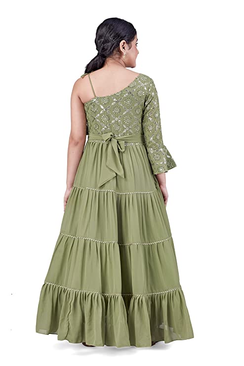Spruce up your wardrobe with this maxi dress from Fashion Dream on Amazon. This stylish dress is perfect for a party, wedding, day out with friends or night of get-togethers. Rekindle your inner beauty by wearing this tiered maxi dress. This readymade attire is enhance with gotta patti lace work and is featured one shoulder with quarter bell sleeve and one side drawstring for perfect bodycon, embroidery work on yoke and sleeve, asymmetric hem and self fabric belt at back side. This maxi dress has cancan attached with lining material that give volumetric flare to this dress. This one is an ideal option for your upcoming wedding or party event. Style this dress with a pair of high heels and statement accessories to complete the look.