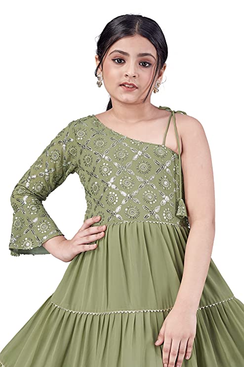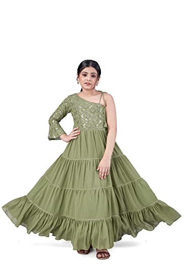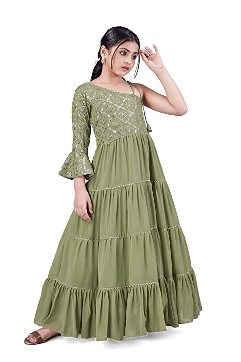 Spruce up your wardrobe with this maxi dress from Fashion Dream on Amazon. This stylish dress is perfect for a party, wedding, day out with friends or night of get-togethers. Rekindle your inner beauty by wearing this tiered maxi dress. This readymade attire is enhance with gotta patti lace work and is featured one shoulder with quarter bell sleeve and one side drawstring for perfect bodycon, embroidery work on yoke and sleeve, asymmetric hem and self fabric belt at back side. This maxi dress has cancan attached with lining material that give volumetric flare to this dress. This one is an ideal option for your upcoming wedding or party event. Style this dress with a pair of high heels and statement accessories to complete the look.